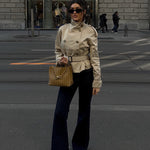 Elevate your wardrobe with our cropped double-breasted trench jacket, a perfect fusion of classic tailoring and modern minimalism. This piece boasts a structured silhouette with traditional trench details like shoulder epaulettes, a belted waist, and adjustable cuffs, all in a chic cropped length.