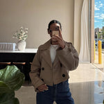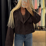 Make a statement this season with our cropped double-breasted trench coat — a modern take on a timeless outerwear essential. Designed with a tailored silhouette, bold contrast buttons and classic trench features, this short coat is perfect for transitional dressing. The structured collar, shoulder epaulettes and adjustable cuffs bring a refined finish to this minimal yet fashion-forward piece. Pair it effortlessly with denim, wide-leg trousers or dresses for an elevated everyday look.