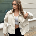 Crafted with a soft-touch suede effect, this cropped jacket features oversized front flap pockets, a classic shirt-style collar, and a sleek button-down front. The structured shape flatters effortlessly, making it an easy match with jeans, trousers, or skirts for both casual and refined looks.
