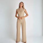 Exude elegance in this structured high-waisted sleeveless jumpsuit, tailored to perfection in a timeless beige tone. The minimalist design, combined with clean lines and a flattering waistband, makes this piece a sophisticated essential for any modern wardrobe.