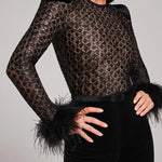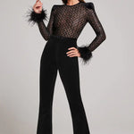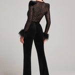 Dazzle the night away in this show-stopping velvet jumpsuit, featuring a dramatic sheer bodice adorned with geometric sequins and luxurious feather-trimmed cuffs. With a bold yet elegant silhouette, this piece is designed for glamorous evenings and unforgettable events.