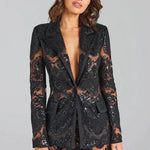Make a bold entrance with this striking black lace co-ord set — featuring a sheer tailored blazer and matching flared trousers with intricate lace and sequin detailing. This two-piece ensemble delivers seductive elegance, blending transparency with structure. Whether you’re dressing for an evening gala, exclusive party or high-fashion event, this look guarantees spotlight attention.