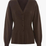 Embrace the perfect balance of comfort and sophistication with this V-Neck Knit Cardigan, designed to flatter your figure while keeping you stylish through Autumn and Winter. Its waist-defining ribbed design creates a beautifully sculpted silhouette, complemented by elegant lantern sleeves that add a soft, feminine touch. Crafted for versatility, this cardigan transitions effortlessly from casual daywear to refined evening style. Whether layered over a dress or paired with jeans, it’s an essential piece for a polished seasonal wardrobe.